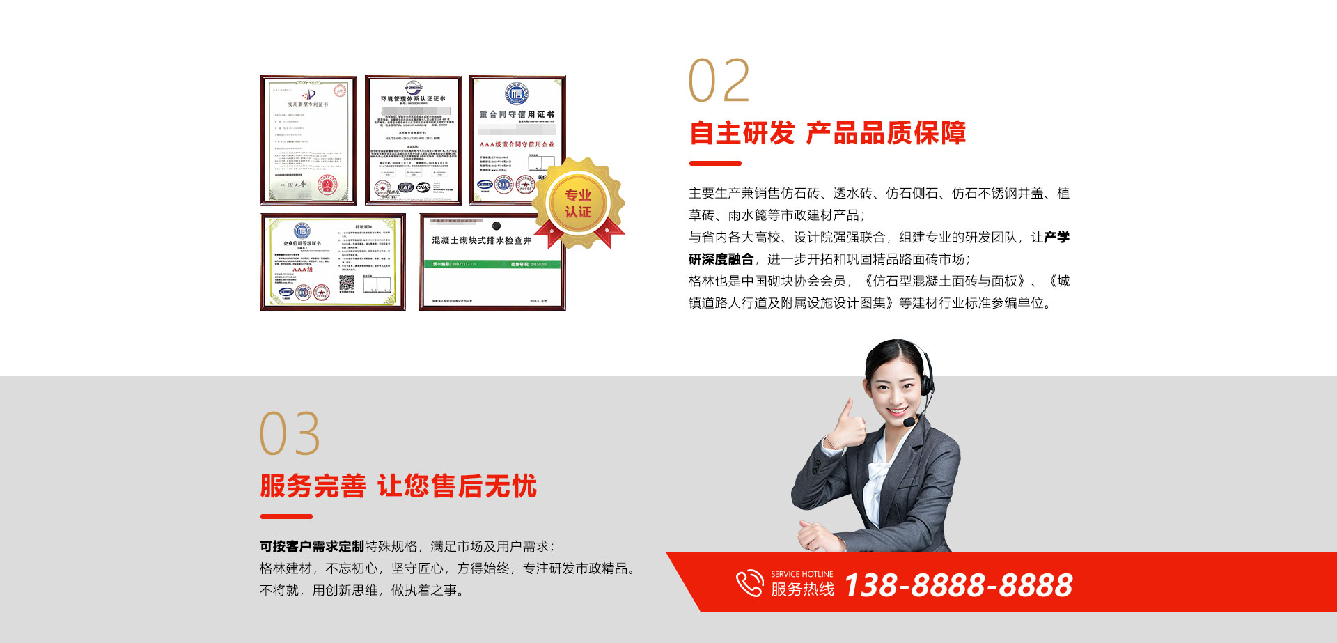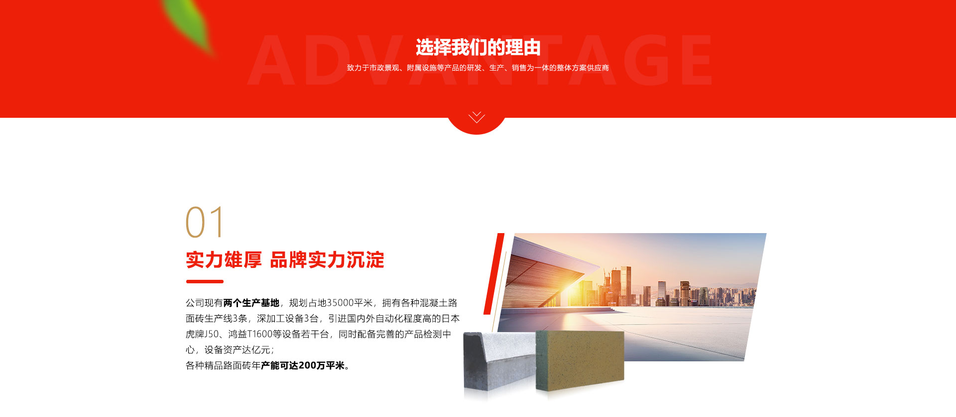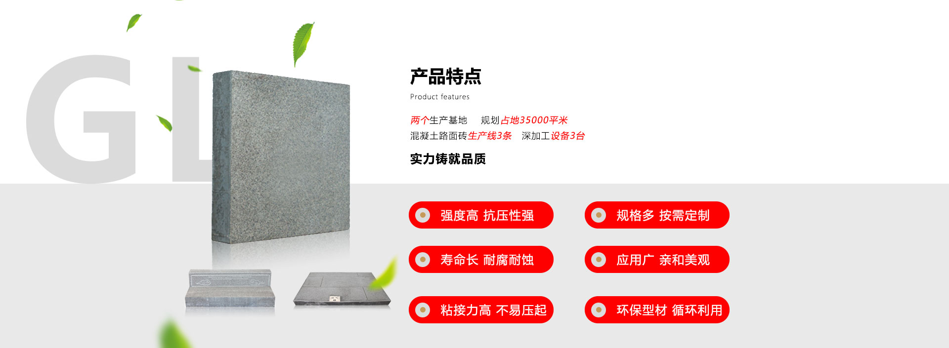 公司引进日本TIGER虎牌J50全自动生产线1条,鸿益T1600全自动生产线1条,新实丰QT5-20B3仿石侧石生产线1条,设备核心技术处于国内前列水平,可年产200万平米仿石砖等路面砖产品和年产60万米仿石侧石,同时具备水磨、抛丸、混色、刷磨、水洗等深加工设备和技术,通过ISO9001国际质量管理体系认证、ISO14001环境体系认证、ISO45001:2008职业健康安全管理体系认证,车间执行安全标准化生产,产品各项指标明显优于国标要求。